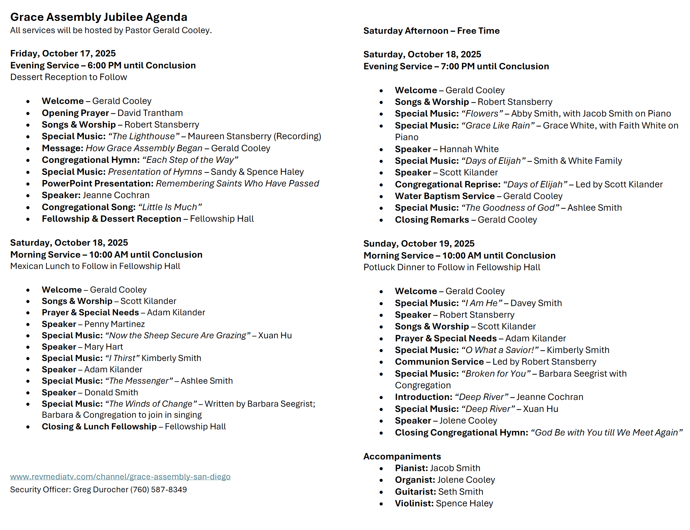 Grace Assembly Golden Jubilee Scheduled Services: